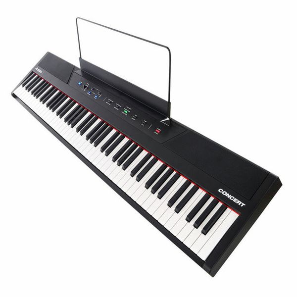 The Alesis Concert is an affordable, easy-to-play digital piano featuring 88 full-size, semi-weighted keys with adjustable touch response and 10 vibrant voices: Acoustic Piano, Bright Piano, Electric Piano, Harpsichord, Drawbar Organ, Church Organ, Synth, Strings, Bass, and Clavi. You can customize the voices by combining any two at once in Layer Mode for a full, rich tone, or you can assign voices to just the left or right hands in Split Mode. Add some tasty reverb and chorus to further enhance your sound. With built-in, 20-watt speakers and 128-note polyphony, the Alesis Concert delivers lush, realistic sound and a satisfying playing experience.