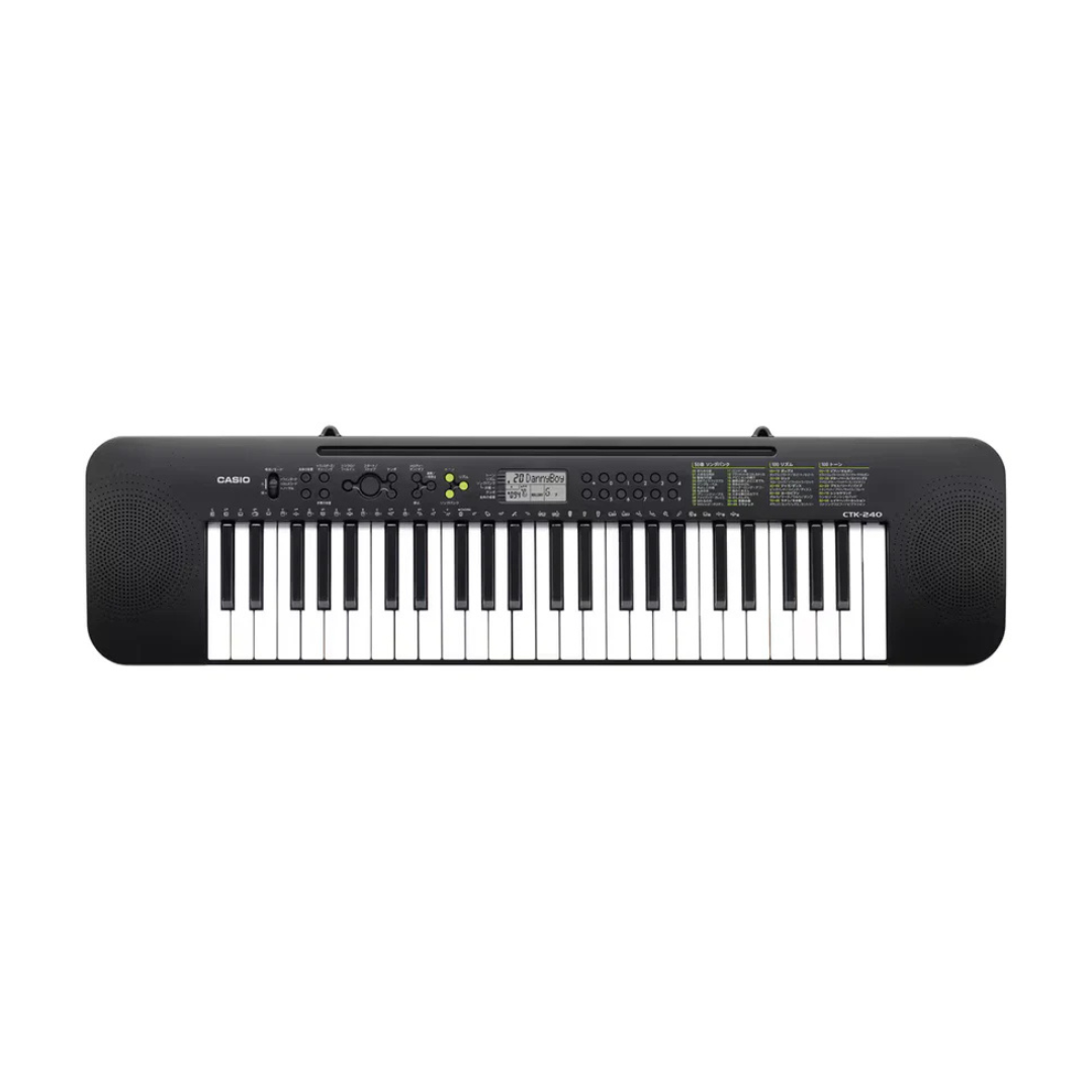 The Casio CTK-240 is a compact, entry-level keyboard equipped with 49 full-size keys that mirror standard piano key size. It offers 100 built-in tones and 100 accompaniment rhythms, making it versatile for beginners exploring different sounds and styles. The keyboard also includes 50 internal songs and a Melody On/Off lesson function, which lets you mute the melody in songs so you can play along. The simple LCD display shows helpful information for selecting voices, rhythms, and settings.