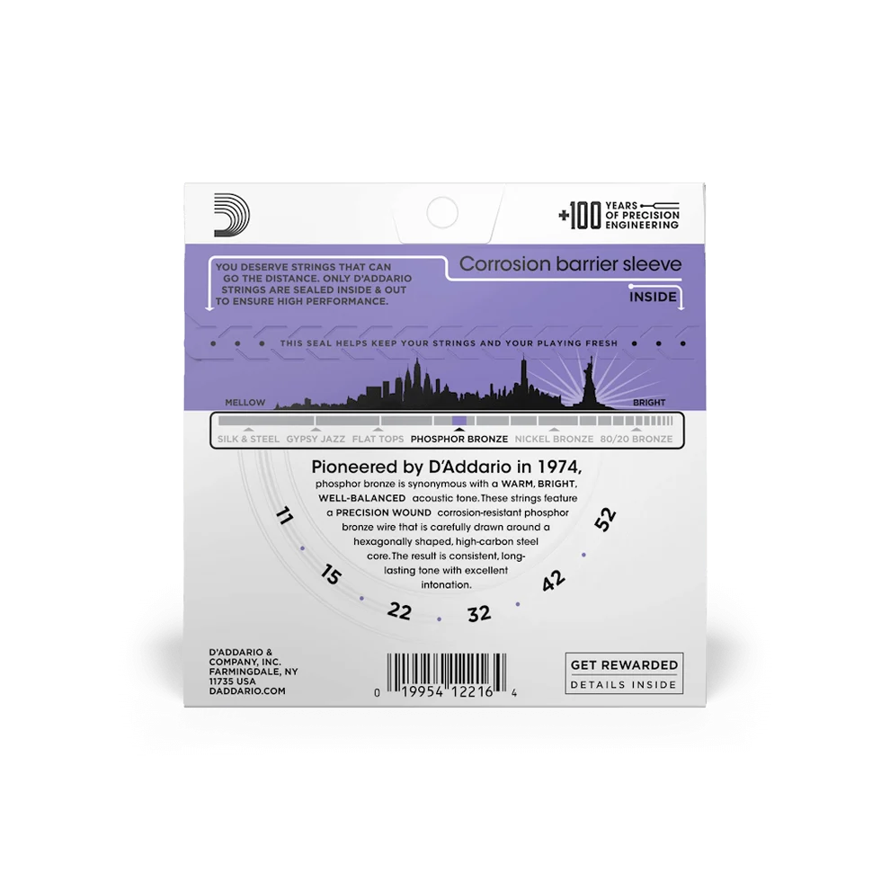 D'Addario was the first to use Phosphor Bronze in acoustic guitar strings back in 1974. Today, Phosphor Bronze is played throughout the world and considered to be the standard in acoustic strings, thanks to its beautiful sonic balance and tonal warmth. Our pioneering Phosphor Bronze acoustic guitar strings are precision wound with phosphor bronze wrap wire over a high-carbon steel core, providing tonal versatility suitable for all acoustic styles and musical genres. These 11-52 Custom Light gauge strings have slightly more volume and projection than Extra Light, while still being easy to play.