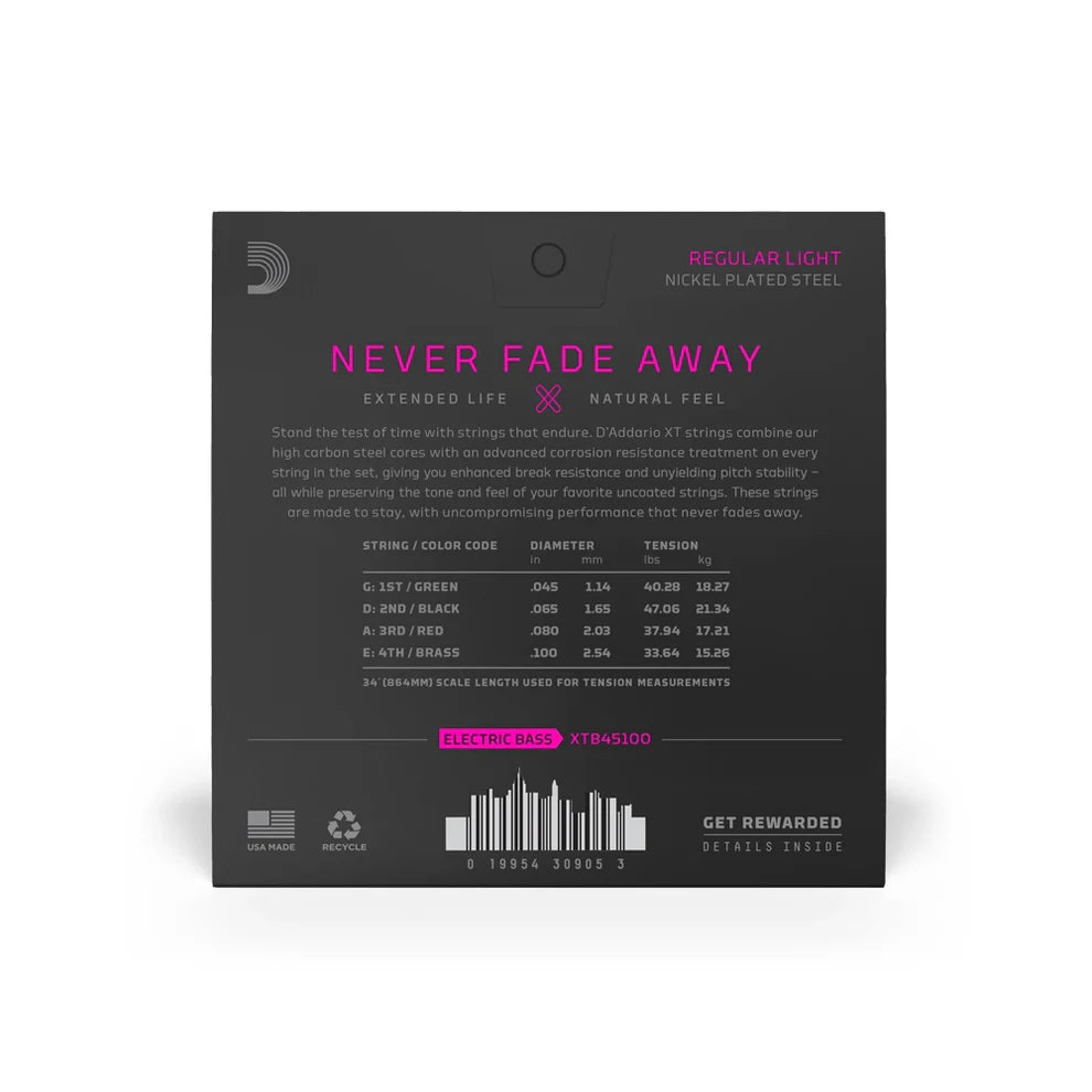 XT Nickel bass strings offer enhanced strength, better pitch stability and longer-lasting performance than standard bass guitar strings. The XT coating provides advanced corrosion resistance, while still retaining the bright tone and natural feel of an uncoated bass string. Beneath the coating, XT Nickel bass guitar strings are constructed with a NY Steel core, nickel-plated steel wrap wire, and Fusion Twist technology, resulting in added resilience and tonal versatility, excellent for a wide range of musical styles. This 45-100 Regular Light gauge set is our most popular gauge, providing a perfect blend of response and playability.