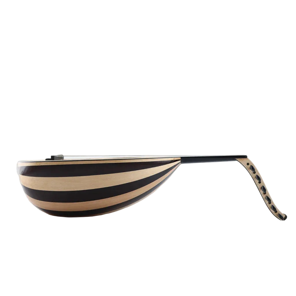The Damascian Khan Oud is a beautifully crafted six-string instrument that brings traditional Middle Eastern music to life without breaking the bank. Built for comfort and authenticity, this oud features a solid spruce top that delivers bright, crystalline tones perfect for capturing the warmth of classic oud melodies. The maple and wenge bowl paired with a nitrocellulose glossy finish creates a stunning visual presence while ensuring durability through years of playing. Three elegant rosettes frame the soundhole, adding traditional charm to every performance. Tuned to Ccc (Do-Do), this oud produces the rich, resonant tones that define authentic oud music. Practical features make this instrument a joy to play: sturdy ebony pegs keep your tuning rock-solid, a 19 cm neck offers comfortable reach for intricate finger work, and a fixed bridge setup provides excellent stability and sustain. Whether you're diving into oud for the first time or you're an experienced player looking for a reliable companion, the Damascian Khan Oud delivers the playability and sound quality that inspire creativity and confidence.