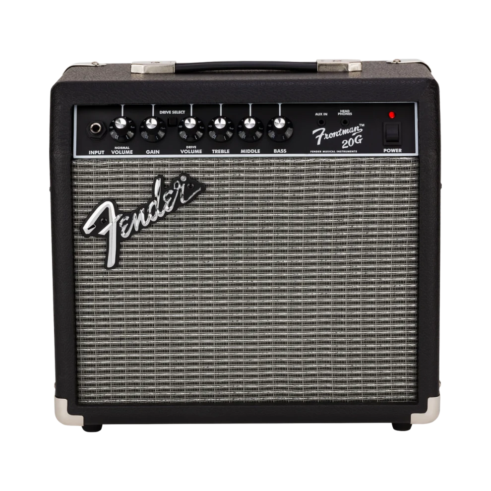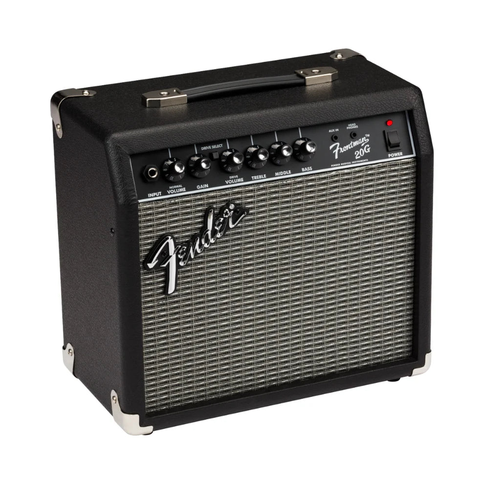 The amplifier features a clean channel with dedicated volume and three-band EQ for full sonic control, alongside a separate switchable Drive channel with its own volume for added distortion and edge. The 1/8" auxiliary input allows you to play along with your favorite tracks, and the headphone output provides silent practice options. Powered by 20 watts and equipped with an 8" Fender Special Design speaker, the Frontman 20G delivers impressive tones for practice, jamming, or small performances.