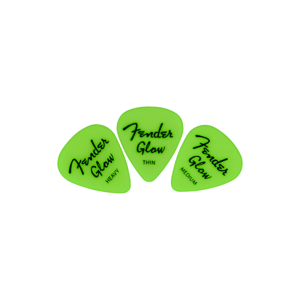 Strum in the dark with Fender glow in the dark picks. Made of our most popular material, cellulose acetate, the 351 shape is for players of versatile styles and techniques. Available in a 12 pack that includes 4 thin, 4 medium, and 4 heavy picks that offer multiple tonal and feel options.