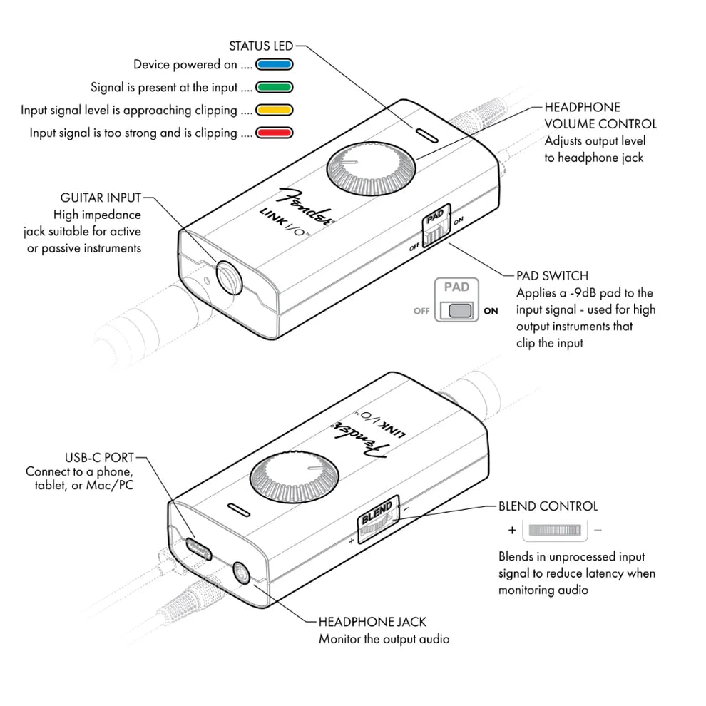 The Fender Link I/O™ is a pocket-sized, studio-quality audio interface designed for guitarists and creators on the go. With 24-bit / 96kHz conversion, a high-impedance input stage that feels just like plugging into a Fender amp, and seamless USB-C connectivity, it delivers pristine tone straight into your device. Real-time LED metering, side-mounted mix control, and latency-free monitoring ensure pro-level performance whether recording, practicing, or streaming.