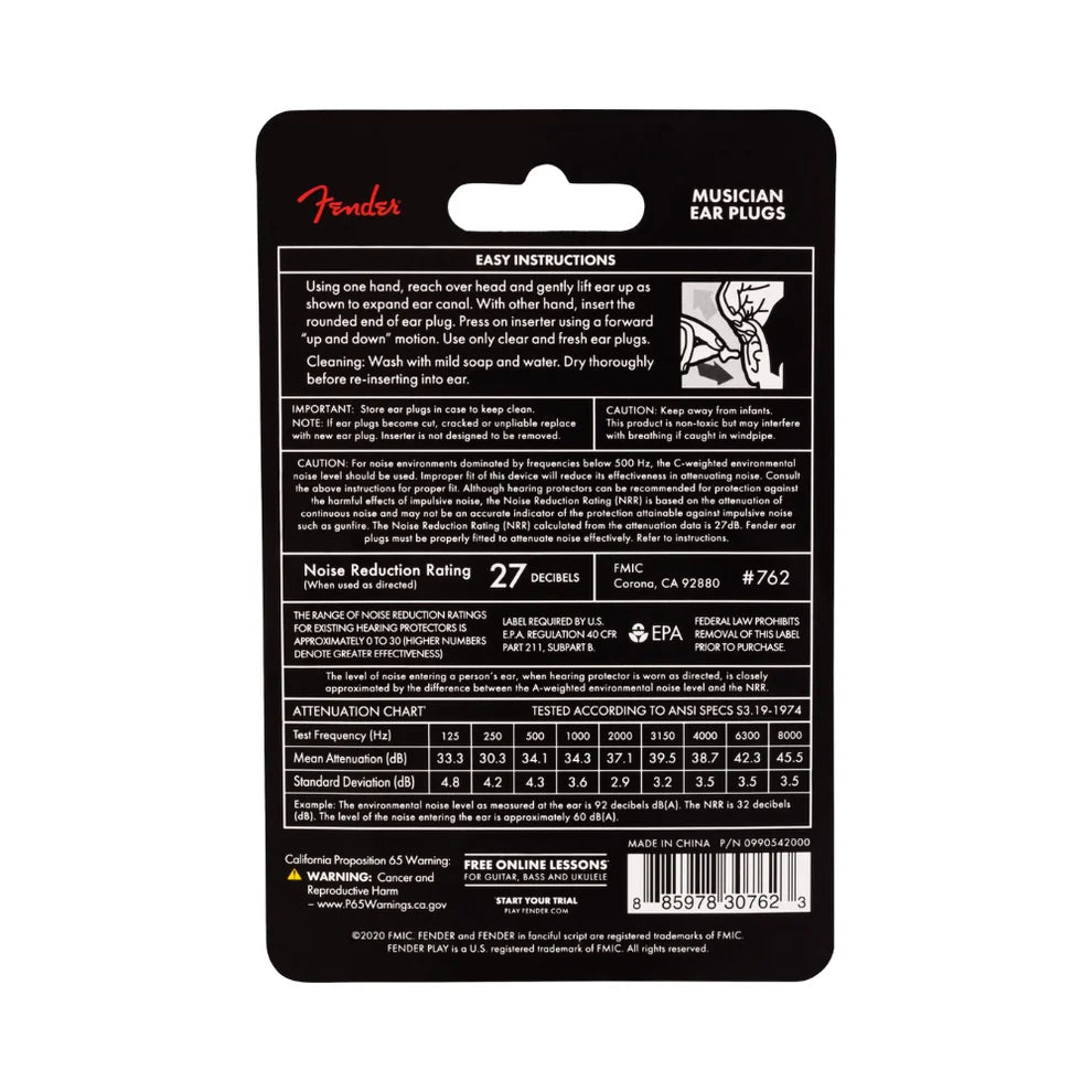 Designed to protect musicians’ hearing, the Fender Musician Series Ear Plugs reduce noise by 27 decibels when worn correctly, helping prevent tinnitus while preserving sound clarity. Ideal for rehearsals, gigs, and high-volume environments, these earplugs combine comfort and durability.