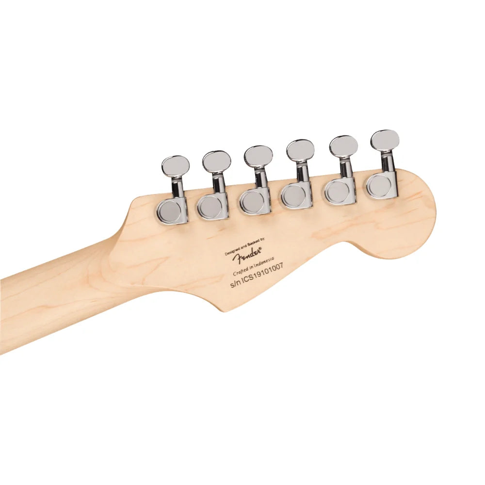 The Squier Mini Stratocaster® is the perfect companion for players seeking a reduced-size instrument with classic styling and familiar Fender® tone. Highlights include a thin and lightweight body, an easy-to-play "C"-shaped neck profile, a trio of Squier single-coil pickups with 5-way switching for sonic variety, and a hardtail bridge for solid tuning stability.